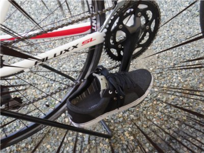 しかもペダルは反対側フラットになっているタイプなので、普通のスニーカーでも漕げます。